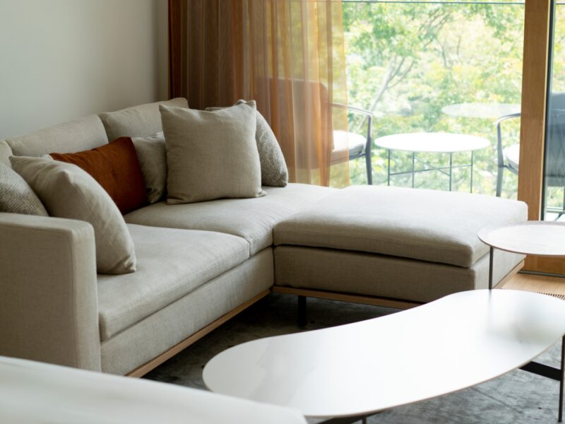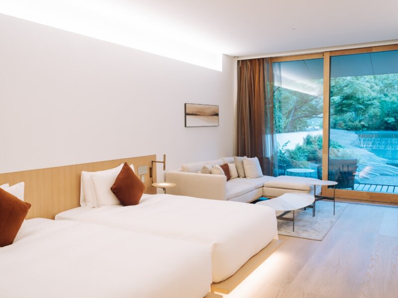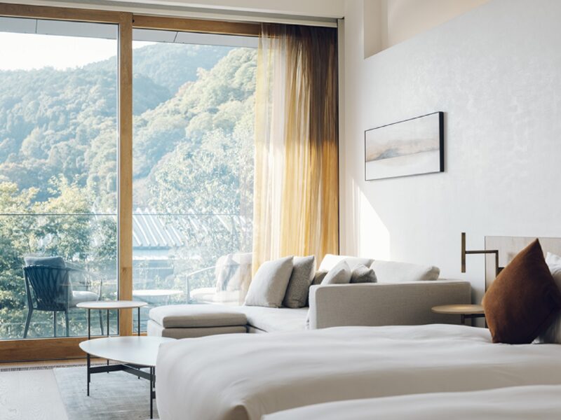 Over 50 square meters of spacious rooms overlooking the Togetsu Bridge and the Oigawa River. Large windows reflecting the changing seasons offer a borrowed view of the natural beauty of Arashiyama.